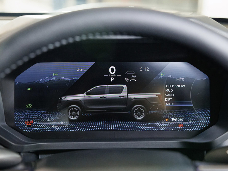 màn hình taplo kỹ thuật số (digital cluster) của một xe bán tải Toyota Hilux mới hiện đại, thể thao, giúp người lái dễ theo dõi thông tin và tùy chỉnh chế độ lái nhanh chóng
